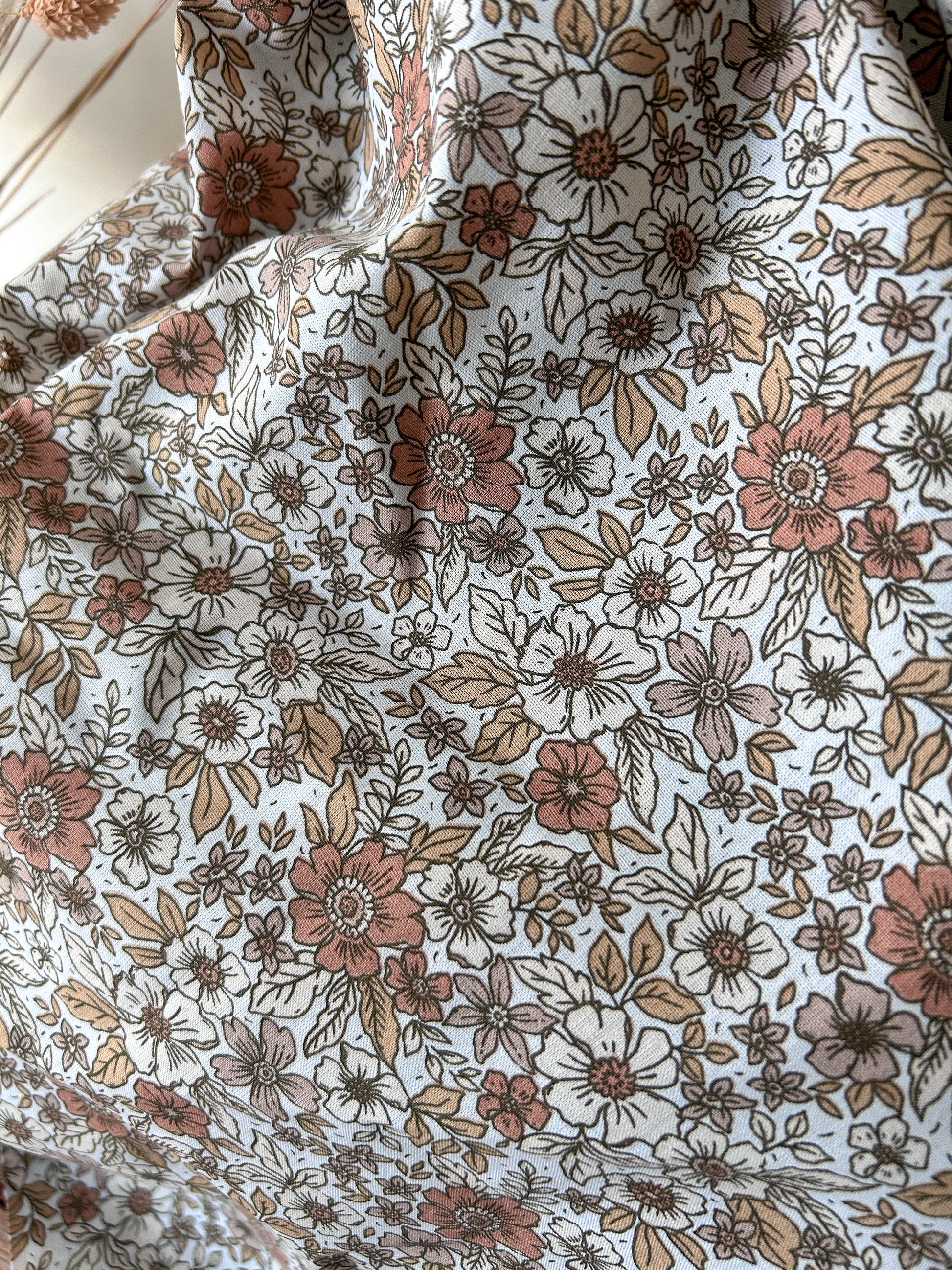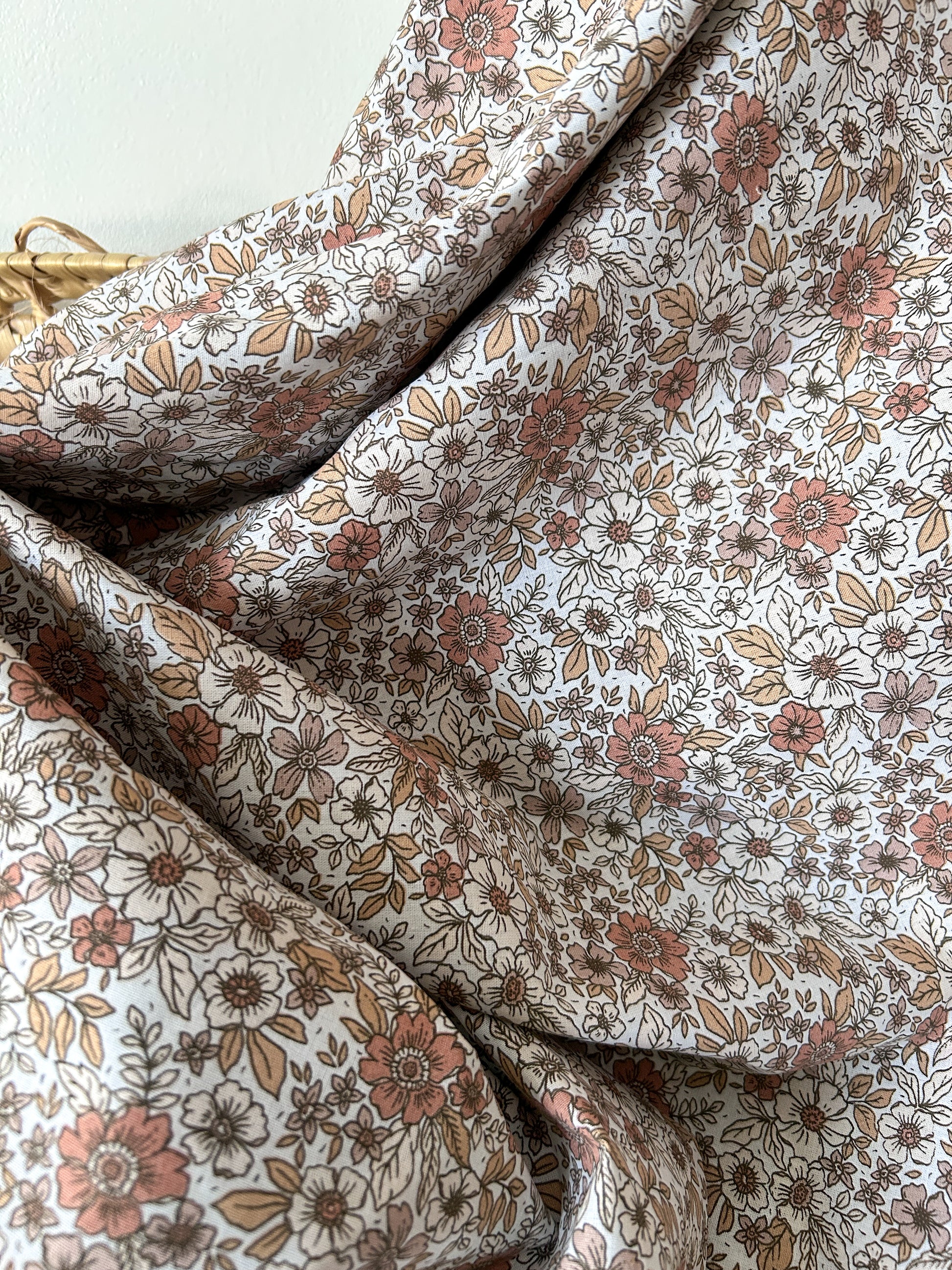 Un tissu popeline au motif floral terracotta et beige, délicat et intemporel. Léger, respirant et agréable au toucher, il sera parfait pour vos créations de vêtements, accessoires ou éléments de décoration au style bohème et raffiné.