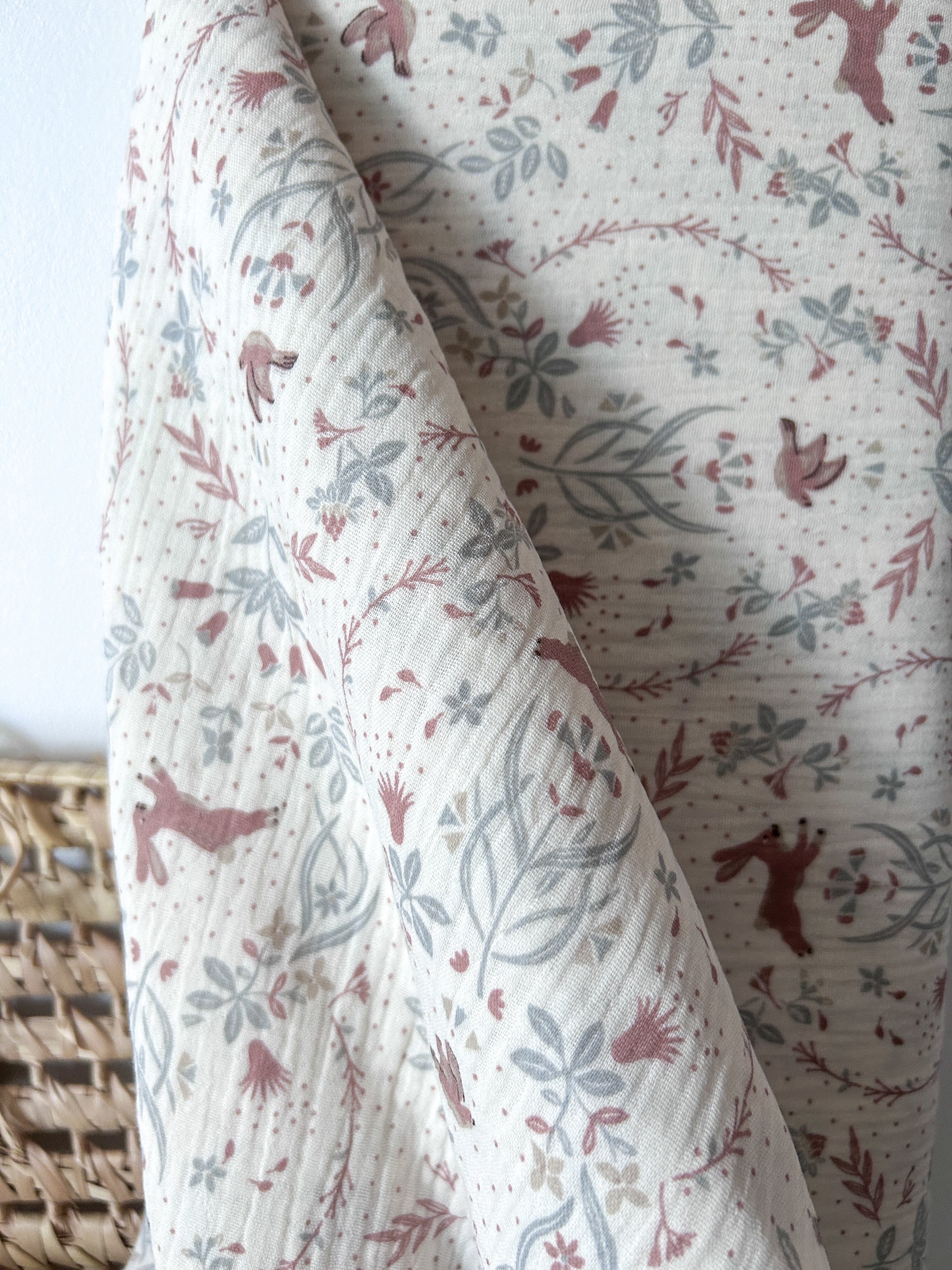 Une double gaze de coton au charme naturel, ornée de jolis lapins, d’oiseaux et de feuillages délicats dans des teintes pastel.