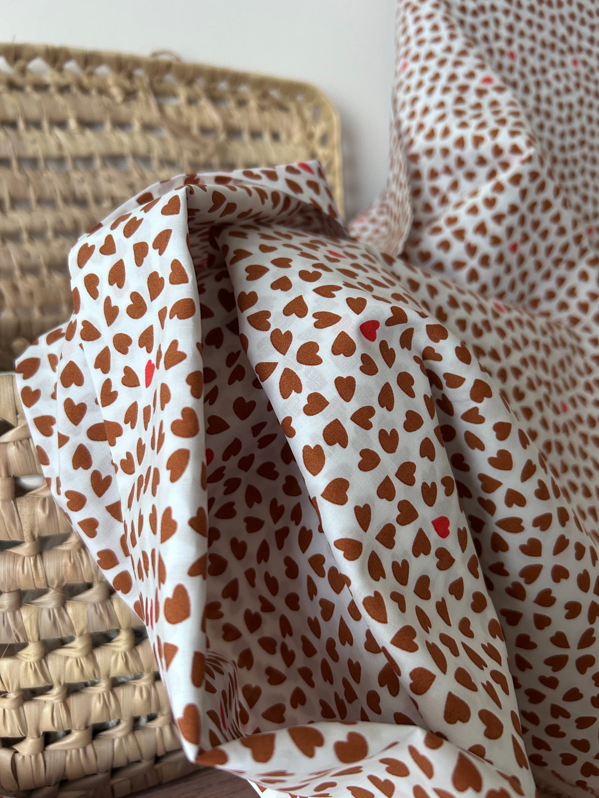Une popeline en coton au motif cœur camel avec de délicates touches de rouge. Fine, douce et facile à coudre, parfaite pour vêtements, accessoires, décoration et couture créative au style tendre et joyeux.