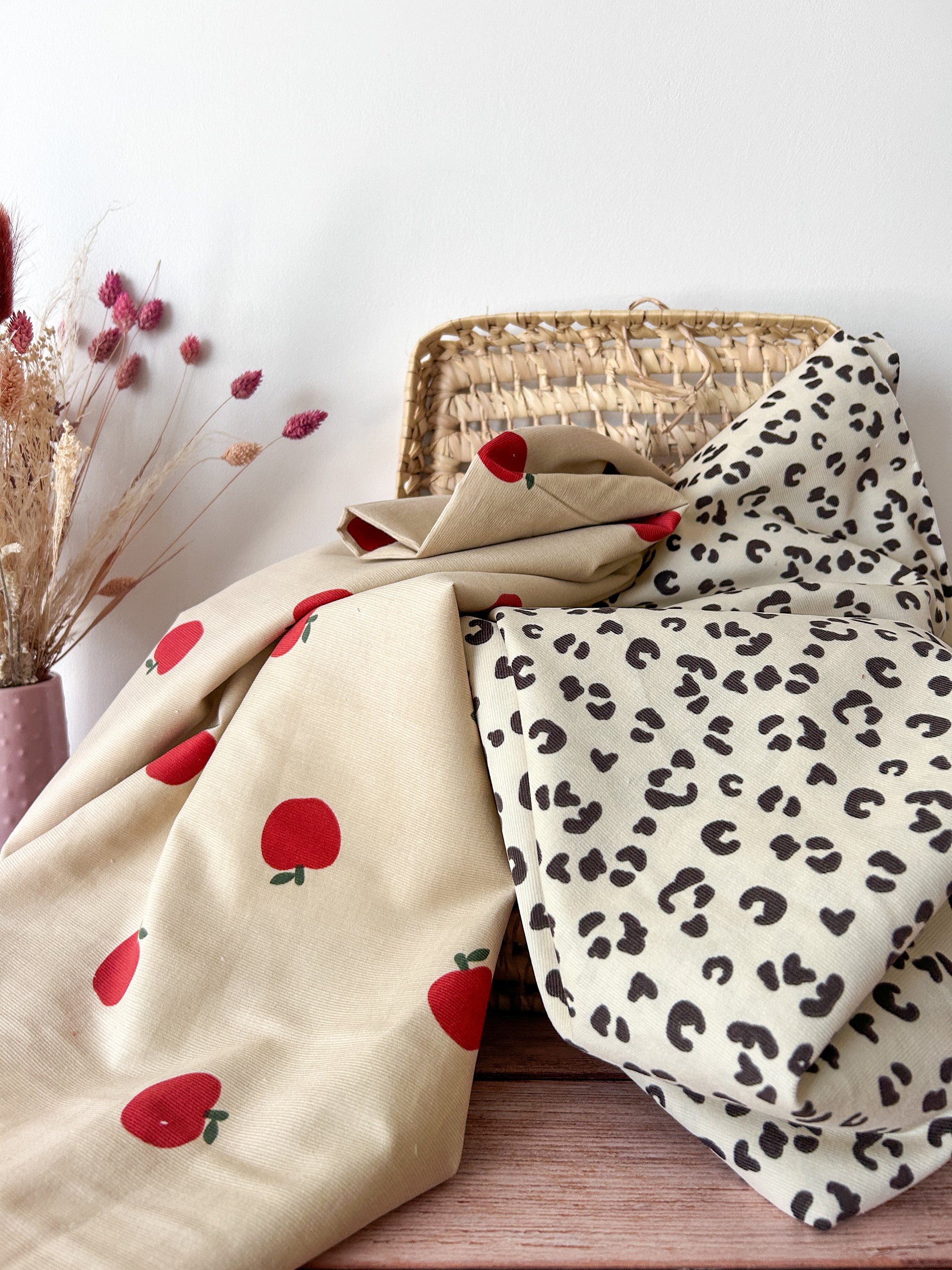 Un tissu velours milleraies au motif pommes rouges sur fond beige rosé, idéal pour des créations à la fois douces, ludiques et pleines de caractère. Parfait pour coudre des vêtements confortables, des accessoires ou de la déco chaleureuse.